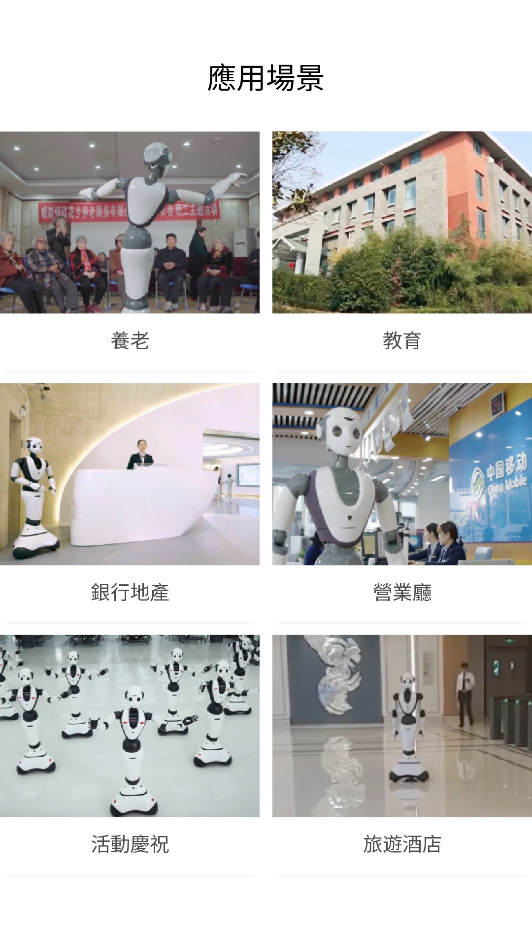為各類客戶提供迎賓接待、引導講解、群舞演繹、業務辦理、養老陪伴、教學科研等應用服務。